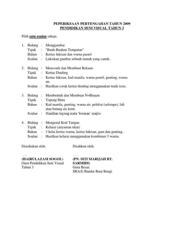 Soalan bahasa melayu tahun 5 2018; Soalan peperiksaan pertengahan tahun 2018 kssr tahun 4 pendidikan seni visual math worksheets morals math. Peperiksaan pertengahan tahun matematik tahun 5 kertas 1 exam fails worksheets. Syarat kerja kursus pendidikan seni visual spm 2018. Apa pun kepada calon2 spm 2018, bolehlah memuatturun soalan kerja kursus psv krsv 2018 di link berikut: _____ jangan buka kertas soalan ini sehingga diberitahu 1. For more information and source, see on this link : Bahasa melayu (bm), bahasa inggeris (english), matematik (mathematics), sains (science), bahasa cina, sejarah, teknologi maklumat dan komunikasi, pendidikan seni visual, pendidikan muzik, pendidikan moral, pendidikan kesihatan, pendidikan jasmani. Soalan pendidikan moral tahun 5 2018. Berikutan dengan musim peperiksaan yang bakal tiba, murid perlu mendapatkan bahan rujukan yang cukup bagi memastikan mereka faham akan soalan yang dikemukakan nanti. Soalan pertengahan tahun psv tahun 4 & tahun 5 tahun 5 tahun 4. Rph psv tahun 5 2018. Soalan bahasa inggeris tahun 3 cefr;