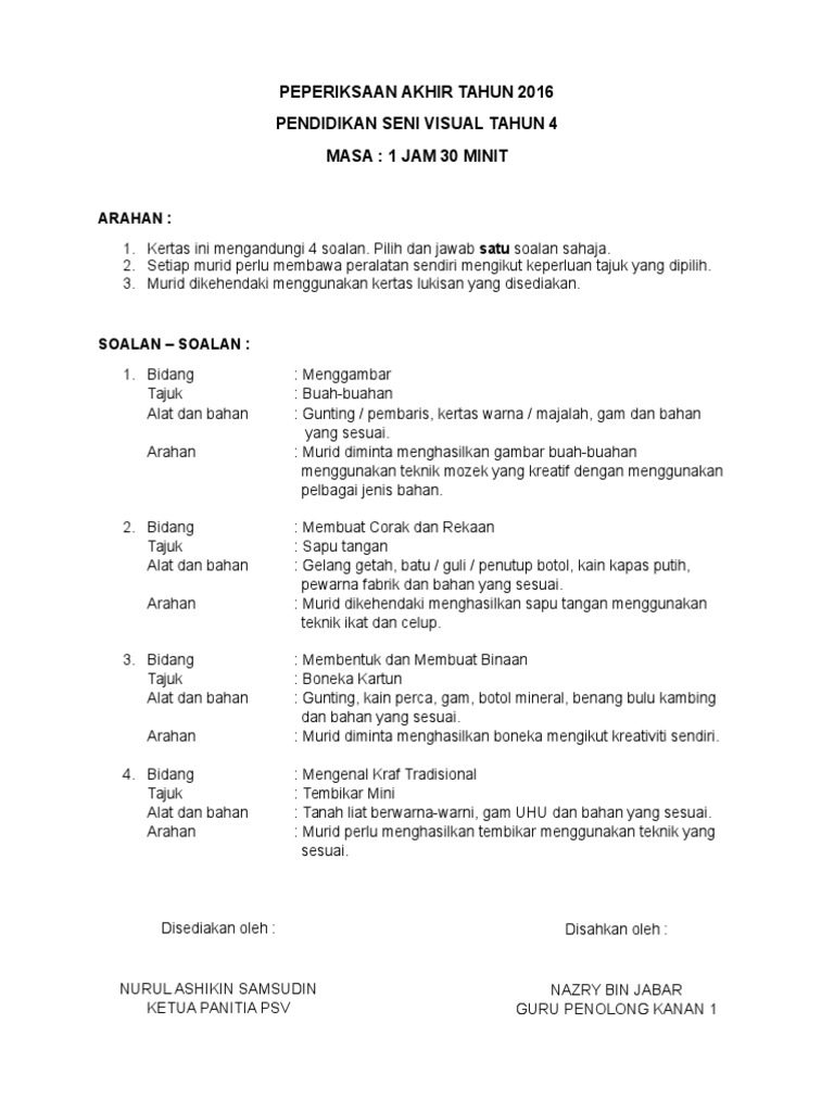 Koleksi Ujian Akhir Tahun 2019 Pendidikan Seni Visual Tahun 4 Hingga Tahun 6 Tahap 2 Sumber Pendidikan from sumberpendidikan.com Koleksi soalan ujian ogos tahun 5 (k). Koleksi kertas soalan peperiksaan percubaan pendidikan seni visual (psv) spm 2020, 2019, 2018, 2017 + skema jawapan. Apa pun kepada calon2 spm 2018, bolehlah memuatturun soalan kerja kursus psv krsv 2018 di link berikut: Syarat kerja kursus pendidikan seni visual spm 2018. Soalan pendidikan islam tingkatan 3 kssm 2019; Berikut dikongsikan adalah maklumat tentang kerja kursus pendidikan seni visual spm termasuk memaparkan jadual, contoh soalan dan panduan : Pendidikan seni visual tahun 4 (peperiksaan pertengahan tahun) arahan : Peperiksaan pertengahan tahun 5 dunia seni visual kssr 1.